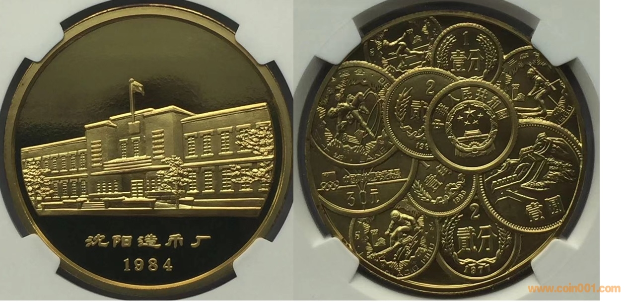 1984年制造,黃銅普制,50mm,沈幣發行。正面為沈幣大樓,反面為長城幣,金銀幣等疊幣圖。此章有紫銅章,看假。