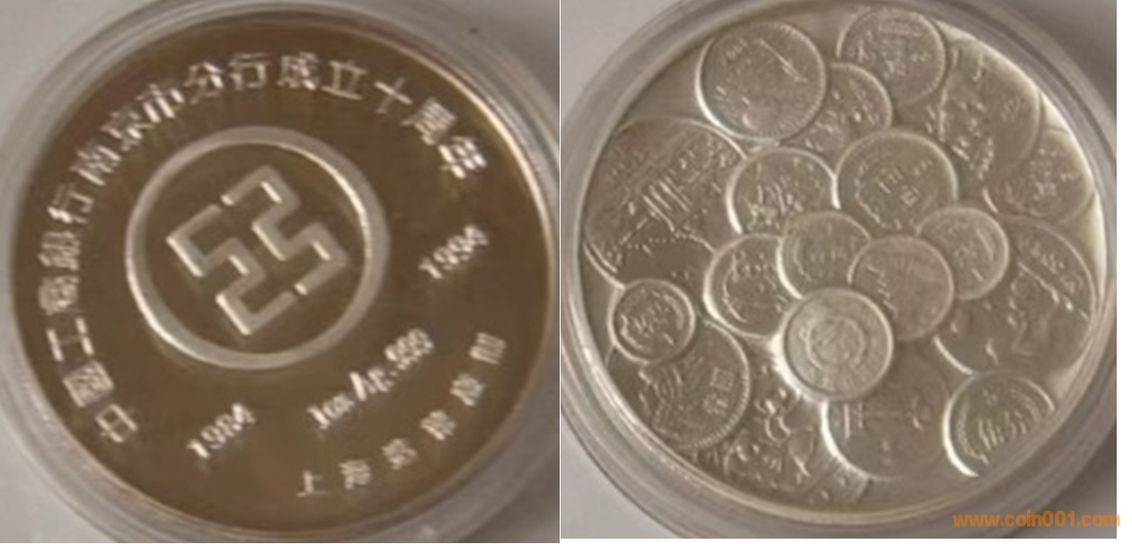 1994年制造,一盎司純銀精制40mm上幣發行。正面為工行圖案,反面為長城幣1元、長城幣2角、長城幣5角及分幣、金銀幣等疊幣圖。