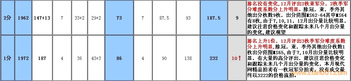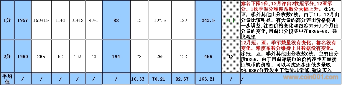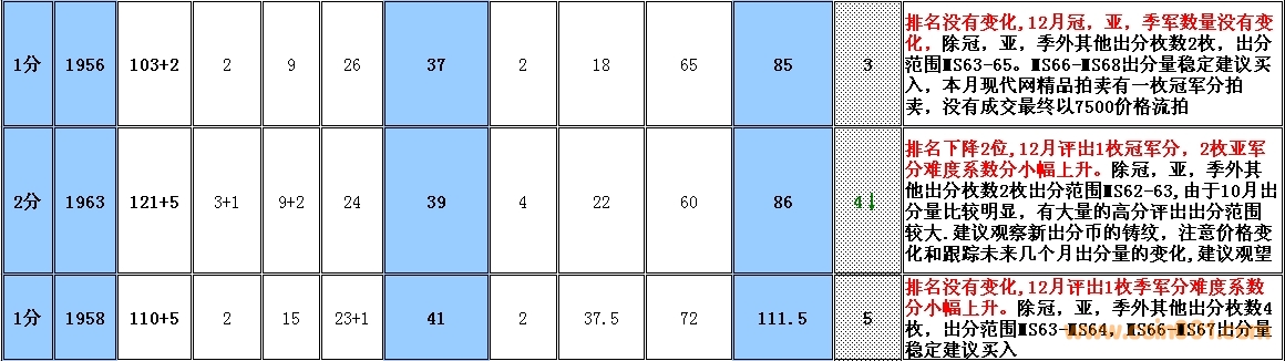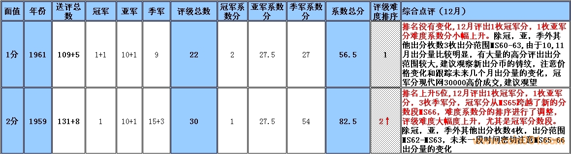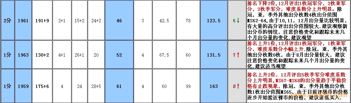 考慮到59年2分的冠軍分數段已經達到MS66,附表將不再更新,(計算目前的送評難度,此表采用最初設計的MS66,MS67,MS68排列方式這個表為附表可以作一些有效的補充)請大家留意,祝大家新年快樂!