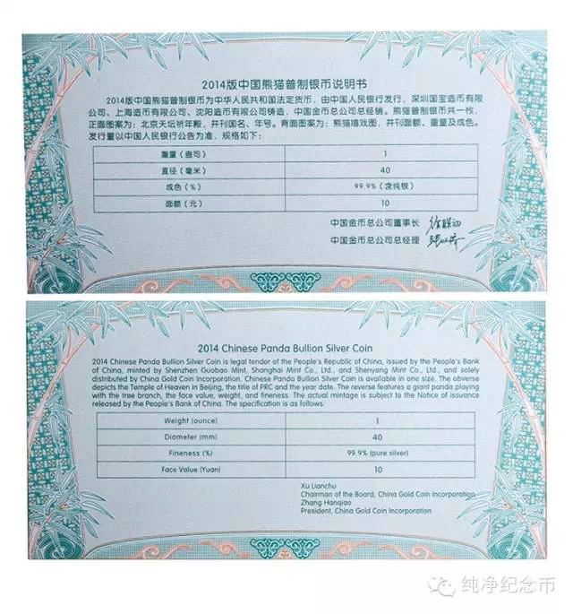 2014熊貓一盎司銀幣是沒有證書的,只有說明書。如果哪天你買的熊貓銀幣有一張證書,那么恭喜你,中獎了!!!