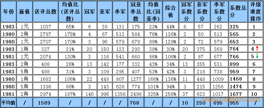 普制長城幣評級難度排序2015-4 普制長城幣評級難度排序與早期分幣難度排序有明顯的區別,為了能體現難度系數的準確性和科學性在計算時考慮的因素相對要復雜一些,主要參考了評級的總數,均值比(送評總數),冠亞季軍總數,均值比(冠亞季總數)等數據作為計算的主要依據,同時各個均值段的補償方法也比較復雜 首先我們需要討論評級幣的價格構成 評級幣的價格構成 裸幣的價格+評級溢價+評級費用=評級幣的參考價格 主要可以參考以下2個因數, 第一個因素為裸幣本生的價格(它的價格變動主要依據裸幣成交價格的變動而變動與評級溢價之間的關系不大) 舉例來說: 裸幣的價格上漲1倍評級難度系數沒有變化的話,評級幣的價格應該相應的上漲1倍+溢價+評級費用=評級幣的參考價格,裸幣的價格的上漲只能帶動評級幣裸幣部分的上升,裸幣價格下跌,評級難度系數沒有變化的話,評級幣的價格為裸幣下跌的價格+溢價+評級費用=評級幣的參考價格,裸幣的價格的下跌只能帶動評級幣裸幣部分的下跌 第二個因素為評級難度所產生的一個溢價 難度系數越高它對應的溢價就越高。溢價變化主要依據評級難度系數與系數平均值的變化和對比來決定,溢價水平的上升在一定的程度上會提升高品質裸幣的價格(卷光卷拆的硬幣)和品相的稀缺性,裸幣價格的下跌,如果評級難度提高的話評級幣的價格反而有可能會上升,從以上的結果可以得出下列結論,溢價是評級價格體系當中最重要的組成部分,溢價和裸幣的價格體系完全是獨立的,之間的價格沒有直接的聯系 備注:關于這個數據的準確性在設計這個表的時候我已經考慮到了一個重評的可能性所以我只取冠,亞,季軍作為一個參考并同時設計了一個補償方案,重評從時間和金錢的角度來衡量的話不是非常經濟且還存在一定的風險,但是從長遠看不能排除這個因數。雖然將來會產生一些誤差,但我認為誤差不會太大尤其在高分段和稀缺性的錢幣,對于普制長城幣來說NGC已經作為收藏的主流其數據的準確性還是比較值得信賴的。 采樣的范圍 取樣范圍:1980-1985 普制長城幣 難度排序的選擇標準:送評總數的平均值高于100%的普制長城幣,低于100%的數據將不體現在難度排序中 計算公式: 評級總數/均值=均值比 考慮到1983年長城幣存世量明顯低于其他年份的普制長城幣,1983年的數據將保留和計入到難度排序中,大家可以通過下面的圖表黃色部分發現被刪除的年份主要是送評溢價不高的年份,如果未來送評量穩步上升的話,它將加入到采樣的范圍. 備:這個采樣的范圍會有一定的誤差,我將根據均值比的變化每個季度第一周進行適當的調整,由于普制長城幣的版別比較復雜,無法進行細分這里主要以年份為主,請大家諒解! 采樣的數據和計算的依據 統計第一檔次每個年份冠,亞,季的出分數量作為一個分析依據,為了能更加的量化我用數字的方法進行統計,方法如下: 調整后的均值比 普制長城幣的計算方法如下: 綜合值的計算方法: (送評總數均值比+冠亞季總數均值比)÷2=綜合值 具體計算方法如下: 均值比在0-50% 冠軍分1枚為1分2枚2分以此類推,亞軍分1枚為2分2枚4分以此類推,季軍1枚為3分2枚6分以此類推 補償方法如下: 如果冠軍分的評分數量大于總數(冠,亞,季之和)的15%,冠軍分的1枚為1.5分,如果冠軍分的評分數量大于總數(冠,亞,季之和)的50%冠軍分的1枚為2分 如果亞軍分的評分數量大于總數(冠,亞,季之和)的35%,亞軍分的1枚為2.5分,如果亞軍分的評分數量低于總數(冠,亞,季之和)的25%亞軍分的1枚為1.5分 季軍分的評分數量大于總數(冠,亞,季之和)的65%,季軍分的1枚為2.5分, 季軍分的評分數量大于總數(冠,亞,季之和)的85%,季軍分的1枚為2分 均值比在50-100% 冠軍分1枚為1分2枚2分以此類推,亞軍分1枚為1.5分2枚3分以此類推,季軍1枚為2分2枚4分以此類推 此范圍+值補償 如果冠軍分的評分數量大于總數(冠,亞,季之和)的50%冠軍分的1枚為1.25分 如果亞軍分的評分數量大于總數(冠,亞,季之和)的35%,亞軍分的1枚為1.75分 均值比在100-150% 冠軍分1枚為0.5分2枚1分以此類推,亞軍分1枚為1分2枚2分以此類推,季軍1枚為1.5分2枚3分以此類推 補償方法如下: 如果冠軍分的評分數量大于總數(冠,亞,季之和)的15%,冠軍分的1枚為0.75分,如果冠軍分的評分數量大于總數(冠,亞,季之和)的50%冠軍分的1枚為1分 如果亞軍分的評分數量大于總數(冠,亞,季之和)的35%,亞軍分的1枚為1.25分,如果亞軍分的評分數量低于總數(冠,亞,季之和)的25%亞軍分的1枚為0.75分 季軍分的評分數量大于總數(冠,亞,季之和)的65%,季軍分的1枚為1.25分, 季軍分的評分數量大于總數(冠,亞,季之和)的85%,季軍分的1枚為1分 均值比在150%-180% 冠軍分1枚為0.5分2枚1分以此類推,亞軍分1枚為0.75分2枚1.5分以此類推,季軍1枚為1.25分2枚2.5分以此類推 如果冠軍分的評分數量大于總數(冠,亞,季之和)的15%,冠軍分的1枚為0.62分,如果冠軍分的評分數量大于總數(冠,亞,季之和)的50%冠軍分的1枚為0.75分 如果亞軍分的評分數量大于總數(冠,亞,季之和)的35%,亞軍分的1枚為1分,如果亞軍分的評分數量低于總數(冠,亞,季之和)的25%亞軍分的1枚為0.5分 季軍分的評分數量大于總數(冠,亞,季之和)的65%,季軍分的1枚為1分, 季軍分的評分數量大于總數(冠,亞,季之和)的85%,季軍分的1枚為0.75分 均值比在180%以上 冠軍分1枚為0.25分2枚0.5分以此類推,亞軍分1枚為0.5