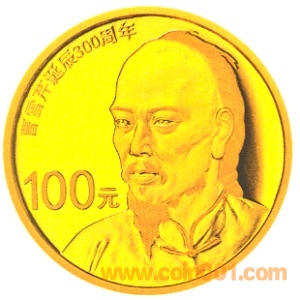 7.776克(1/4盎司)圓形金質(zhì)紀念幣背面圖案為曹雪芹像,并刊“曹雪芹誕辰300周年”字樣及面額。
