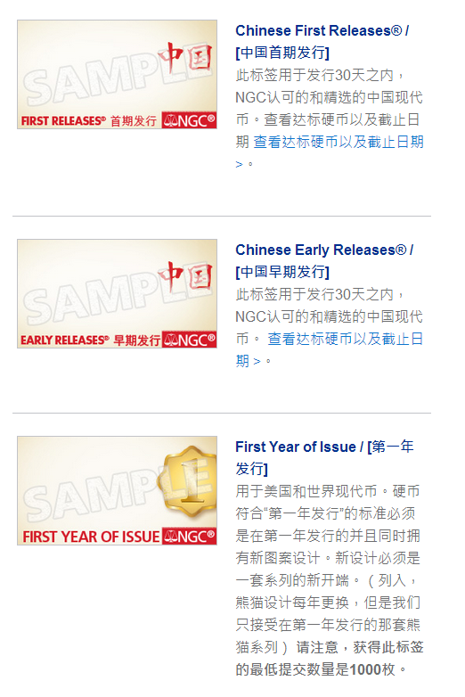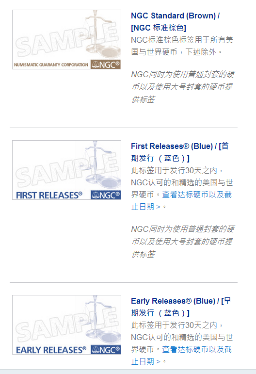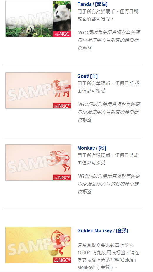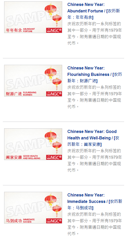 其實真正NGC官方定制發(fā)布的二羊標(biāo)只有:普標(biāo)(老)、(普標(biāo))新、首期藍標(biāo)、首期紅標(biāo)、早期藍標(biāo)、早期紅標(biāo)、剪紙羊(老)、剪紙羊(新)、首年綠標(biāo)、首年金標(biāo)、賀歲標(biāo)(老版為紅底的馬到成功、年年有余、闔家安康、財源廣進、萬事勝意五種)、賀歲標(biāo)(新版為燈籠加上馬到成功、年年有余、闔家安康、財源廣進、萬事勝意五種)