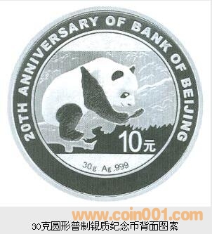 30克圓形銀質紀念幣背面圖案為熊貓攀樹圖,并刊“30g Ag.999”字樣、“北京銀行成立20周年紀念”英文字樣及面額。