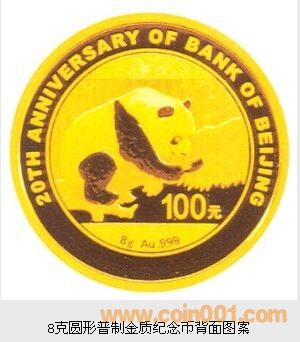 8克圓形金質紀念幣背面圖案為熊貓攀樹圖,并刊“8g Au.999”字樣、“北京銀行成立20周年紀念”英文字樣及面額。