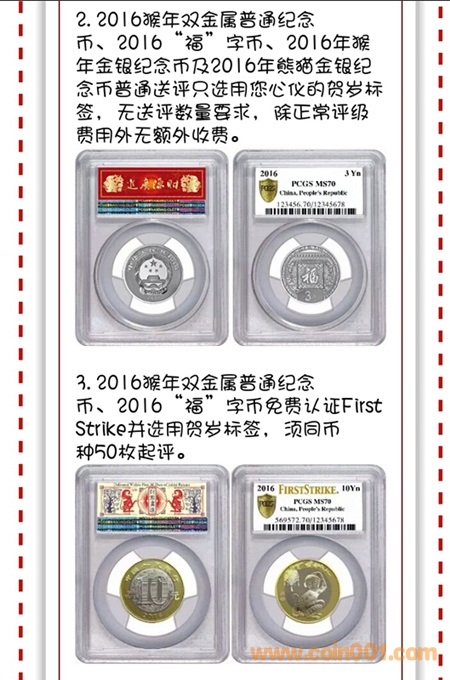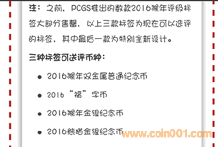 PCGS設計出三種賀歲標簽,無數量限制,適用于:2016猴年雙金屬普通紀念幣,2016“?!弊謳?,2016猴年金銀紀念幣,2016熊貓金銀紀念幣四種幣。
