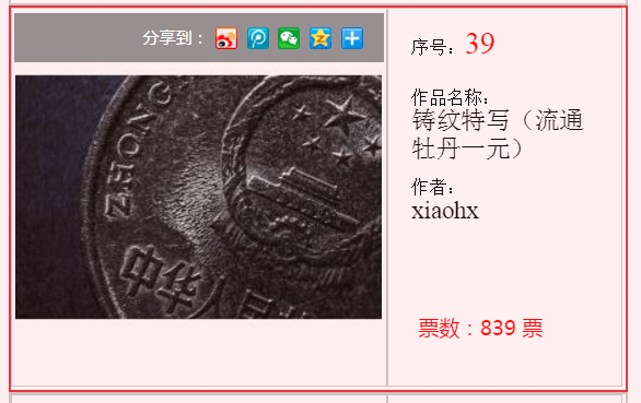 22號作品《頤和園長廊》(創意類三等獎)賞析:我雖然沒見過這枚大銅章(從圖上看像銅質),但這幅微距圖片給人很強的視覺沖出力、很強的透視感,將長廊的縱深拍攝出來了,突出了“長”,廊柱及地面質感也不錯。當我第一眼看到這幅長廊圖的時候就在想,這就是當年慈禧太后走過的長廊嗎?這就是作品的成功之處!