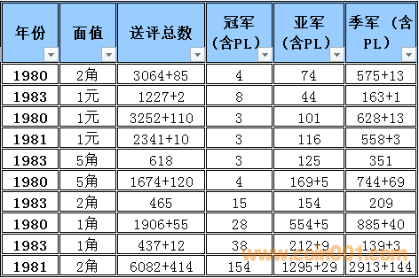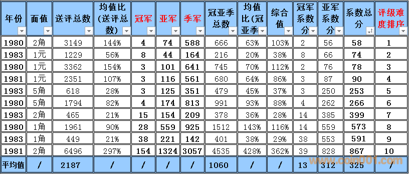 普制長城幣評級難度排序2016-2 (全新改版) 普制長城幣評級難度排序與早期分幣難度排序有明顯的區別,為了能體現難度系數的準確性和科學性在計算時考慮的因素相對要復雜一些,主要參考了評級的總數,均值比(送評總數),冠亞季軍總數,均值比(冠亞季總數)等數據作為計算的主要依據,同時各個均值段的補償方法也比較復雜 首先我們需要討論評級幣的價格構成評級幣的價格構成 裸幣的價格+評級溢價+評級費用=評級幣的參考價格 主要可以參考以下2個因數, 第一個因素為裸幣本生的價格(它的價格變動主要依據裸幣成交價格的變動而變動與評級溢價之間的關系不大) 舉例來說: 裸幣的價格上漲1倍評級難度系數沒有變化的話,評級幣的價格應該相應的上漲1倍+溢價+評級費用=評級幣的參考價格,裸幣的價格的上漲只能帶動評級幣裸幣部分的上升,裸幣價格下跌,評級難度系數沒有變化的話,評級幣的價格為裸幣下跌的價格+溢價+評級費用=評級幣的參考價格,裸幣的價格的下跌只能帶動評級幣裸幣部分的下跌 第二個因素為評級難度所產生的一個溢價難度系數越高它對應的溢價就越高。溢價變化主要依據評級難度系數與系數平均值的變化和對比來決定,溢價水平的上升在一定的程度上會提升高品質裸幣的價格(卷光卷拆的硬幣)和品相的稀缺性,裸幣價格的下跌,如果評級難度提高的話評級幣的價格反而有可能會上升,從以上的結果可以得出下列結論,溢價是評級價格體系當中最重要的組成部分,溢價和裸幣的價格體系完全是獨立的,之間的價格沒有直接的聯系 備注:關于這個數據的準確性在設計這個表的時候我已經考慮到了一個重評的可能性所以我只取冠,亞,季軍作為一個參考并同時設計了一個補償方案,重評從時間和金錢的角度來衡量的話不是非常經濟且還存在一定的風險,但是從長遠看不能排除這個因數。雖然將來會產生一些誤差,但我認為誤差不會太大尤其在高分段和稀缺性的錢幣,對于普制長城幣來說NGC已經作為收藏的主流其數據的準確性還是比較值得信賴的。 采樣的范圍取樣范圍:1980-1985 普制長城幣難度排序的選擇標準:送評總數的平均值高于100%的普制長城幣,低于100%的數據將不體現在難度排序中 計算公式: 評級總數/均值=均值比考慮到1983年長城幣存世量明顯低于其他年份的普制長城幣,1983年的數據將保留和計入到難度排序中,大家可以通過下面的圖表黃色部分發現被刪除的年份主要是送評溢價不高的年份,如果未來送評量穩步上升的話,它將加入到采樣的范圍.備:這個采樣的范圍會有一定的誤差,我將根據均值比的變化每個季度第一周進行適當的調整,由于普制長城幣的版別比較復雜,無法進行細分這里主要以年份為主,請大家諒解! 采樣的數據和計算的依據統計第一檔次每個年份冠,亞,季的出分數量作為一個分析依據,為了能更加的量化我用數字的方法進行統計,方法如下:調整后的均值比 普制長城幣的計算方法如下:綜合值的計算方法:(送評總數均值比+冠亞季總數均值比)÷2=綜合值具體計算方法如下:均值比在0-50%冠軍分1枚為1分2枚2分以此類推,亞軍分1枚為2分2枚4分以此類推,季軍1枚為3分2枚6分以此類推補償方法如下:如果冠軍分的評分數量大于總數(冠,亞,季之和)的15%,冠軍分的1枚為1.5分,如果冠軍分的評分數量大于總數(冠,亞,季之和)的50%冠軍分的1枚為2分如果亞軍分的評分數量大于總數(冠,亞,季之和)的35%,亞軍分的1枚為2.5分,如果亞軍分的評分數量低于總數(冠,亞,季之和)的25%亞軍分的1枚為1.5分 均值比在50-100%冠軍分1枚為1分2枚2分以此類推,亞軍分1枚為1.5分2枚3分以此類推,季軍1枚為2分2枚4分以此類推此范圍+值補償如果冠軍分的評分數量大于總數(冠,亞,季之和)的50%冠軍分的1枚為1.25分如果亞軍分的評分數量大于總數(冠,亞,季之和)的35%,亞軍分的1枚為1.75分 均值比在100-150%冠軍分1枚為0.5分2枚1分以此類推,亞軍分1枚為1分2枚2分以此類推,季軍1枚為1.5分2枚3分以此類推補償方法如下:如果冠軍分的評分數量大于總數(冠,亞,季之和)的15%,冠軍分的1枚為0.75分,如果冠軍分的評分數量大于總數(冠,亞,季之和)的50%冠軍分的1枚為1分如果亞軍分的評分數量大于總數(冠,亞,季之和)的35%,亞軍分的1枚為1.25分,如果亞軍分的評分數量低于總數(冠,亞,季之和)的25%亞軍分的1枚為0.75分 均值比在150%-180%冠軍分1枚為0.5分2枚1分以此類推,亞軍分1枚為0.75分2枚1.5分以此類推,季軍1枚為1.25分2枚2.5分以此類推如果冠軍分的評分數量大于總數(冠,亞,季之和)的15%,冠軍分的1枚為0.62分,如果冠軍分的評分數量大于總數(冠,亞,季之和)的50%冠軍分的1枚為0.75分如果亞軍分的評分數量大于總數(冠,亞,季之和)的35%,亞軍分的1枚為1分,如果亞軍分的評分數量低于總數(冠,亞,季之和)的25%亞軍分的1枚為0.5分 均值比在180%以上冠軍分1枚為0.25分2枚0.5分以此類推,亞軍分1枚為0.5分2枚1分以此類推,季軍1枚為0.75分2枚1.5分以此類推 此范圍+值補償如果冠軍分的評分數量大于總數(冠,亞,季之和)的50%冠軍分的1枚為0.375分如果亞軍分的評分數量大于總數(冠,亞,季之和)的35%,亞軍分的1枚為0.625分 大家可以根據上面的計算方式得出一個結論,難度的高低除了以高分的數量作為一個衡量的標準外評級總量也是一個不可忽視的因數,通常難度是必須通過數據之間的對比,評級總數,冠亞季軍總數是一個非