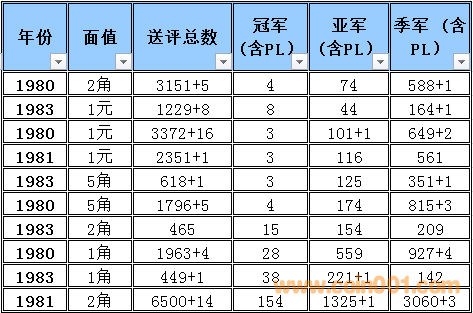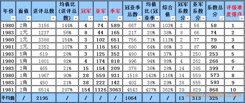 普制長城幣評級難度排序2016-4 (全新改版) 普制長城幣評級難度排序與早期分幣難度排序有明顯的區別,為了能體現難度系數的準確性和科學性在計算時考慮的因素相對要復雜一些,主要參考了評級的總數,均值比(送評總數),冠亞季軍總數,均值比(冠亞季總數)等數據作為計算的主要依據,同時各個均值段的補償方法也比較復雜 首先我們需要討論評級幣的價格構成評級幣的價格構成 裸幣的價格+評級溢價+評級費用=評級幣的參考價格 主要可以參考以下2個因數, 第一個因素為裸幣本生的價格(它的價格變動主要依據裸幣成交價格的變動而變動與評級溢價之間的關系不大) 舉例來說: 裸幣的價格上漲1倍評級難度系數沒有變化的話,評級幣的價格應該相應的上漲1倍+溢價+評級費用=評級幣的參考價格,裸幣的價格的上漲只能帶動評級幣裸幣部分的上升,裸幣價格下跌,評級難度系數沒有變化的話,評級幣的價格為裸幣下跌的價格+溢價+評級費用=評級幣的參考價格,裸幣的價格的下跌只能帶動評級幣裸幣部分的下跌 第二個因素為評級難度所產生的一個溢價難度系數越高它對應的溢價就越高。溢價變化主要依據評級難度系數與系數平均值的變化和對比來決定,溢價水平的上升在一定的程度上會提升高品質裸幣的價格(卷光卷拆的硬幣)和品相的稀缺性,裸幣價格的下跌,如果評級難度提高的話評級幣的價格反而有可能會上升,從以上的結果可以得出下列結論,溢價是評級價格體系當中最重要的組成部分,溢價和裸幣的價格體系完全是獨立的,之間的價格沒有直接的聯系 備注:關于這個數據的準確性在設計這個表的時候我已經考慮到了一個重評的可能性所以我只取冠,亞,季軍作為一個參考并同時設計了一個補償方案,重評從時間和金錢的角度來衡量的話不是非常經濟且還存在一定的風險,但是從長遠看不能排除這個因數。雖然將來會產生一些誤差,但我認為誤差不會太大尤其在高分段和稀缺性的錢幣,對于普制長城幣來說NGC已經作為收藏的主流其數據的準確性還是比較值得信賴的。 采樣的范圍取樣范圍:1980-1985 普制長城幣難度排序的選擇標準:送評總數的平均值高于100%的普制長城幣,低于100%的數據將不體現在難度排序中 計算公式: 評級總數/均值=均值比考慮到1983年長城幣存世量明顯低于其他年份的普制長城幣,1983年的數據將保留和計入到難度排序中,大家可以通過下面的圖表黃色部分發現被刪除的年份主要是送評溢價不高的年份,如果未來送評量穩步上升的話,它將加入到采樣的范圍.備:這個采樣的范圍會有一定的誤差,我將根據均值比的變化每個季度第一周進行適當的調整,由于普制長城幣的版別比較復雜,無法進行細分這里主要以年份為主,請大家諒解! 采樣的數據和計算的依據統計第一檔次每個年份冠,亞,季的出分數量作為一個分析依據,為了能更加的量化我用數字的方法進行統計,方法如下:調整后的均值比 普制長城幣的計算方法如下:綜合值的計算方法:(送評總數均值比+冠亞季總數均值比)÷2=綜合值具體計算方法如下:均值比在0-50%冠軍分1枚為1分2枚2分以此類推,亞軍分1枚為2分2枚4分以此類推,季軍1枚為3分2枚6分以此類推補償方法如下:如果冠軍分的評分數量大于總數(冠,亞,季之和)的15%,冠軍分的1枚為1.5分,如果冠軍分的評分數量大于總數(冠,亞,季之和)的50%冠軍分的1枚為2分如果亞軍分的評分數量大于總數(冠,亞,季之和)的35%,亞軍分的1枚為2.5分,如果亞軍分的評分數量低于總數(冠,亞,季之和)的25%亞軍分的1枚為1.5分 均值比在50-100%冠軍分1枚為1分2枚2分以此類推,亞軍分1枚為1.5分2枚3分以此類推,季軍1枚為2分2枚4分以此類推此范圍+值補償如果冠軍分的評分數量大于總數(冠,亞,季之和)的50%冠軍分的1枚為1.25分如果亞軍分的評分數量大于總數(冠,亞,季之和)的35%,亞軍分的1枚為1.75分 均值比在100-150%冠軍分1枚為0.5分2枚1分以此類推,亞軍分1枚為1分2枚2分以此類推,季軍1枚為1.5分2枚3分以此類推補償方法如下:如果冠軍分的評分數量大于總數(冠,亞,季之和)的15%,冠軍分的1枚為0.75分,如果冠軍分的評分數量大于總數(冠,亞,季之和)的50%冠軍分的1枚為1分如果亞軍分的評分數量大于總數(冠,亞,季之和)的35%,亞軍分的1枚為1.25分,如果亞軍分的評分數量低于總數(冠,亞,季之和)的25%亞軍分的1枚為0.75分 均值比在150%-180%冠軍分1枚為0.5分2枚1分以此類推,亞軍分1枚為0.75分2枚1.5分以此類推,季軍1枚為1.25分2枚2.5分以此類推如果冠軍分的評分數量大于總數(冠,亞,季之和)的15%,冠軍分的1枚為0.62分,如果冠軍分的評分數量大于總數(冠,亞,季之和)的50%冠軍分的1枚為0.75分如果亞軍分的評分數量大于總數(冠,亞,季之和)的35%,亞軍分的1枚為1分,如果亞軍分的評分數量低于總數(冠,亞,季之和)的25%亞軍分的1枚為0.5分 均值比在180%以上冠軍分1枚為0.25分2枚0.5分以此類推,亞軍分1枚為0.5分2枚1分以此類推,季軍1枚為0.75分2枚1.5分以此類推 此范圍+值補償如果冠軍分的評分數量大于總數(冠,亞,季之和)的50%冠軍分的1枚為0.375分如果亞軍分的評分數量大于總數(冠,亞,季之和)的35%,亞軍分的1枚為0.625分 大家可以根據上面的計算方式得出一個結論,難度的高低除了以高分的數量作為一個衡量的標準外評級總量也是一個不可忽視的因數,通常難度是必須通過數據之間的對比,評級總數,冠亞季軍總數是一個非