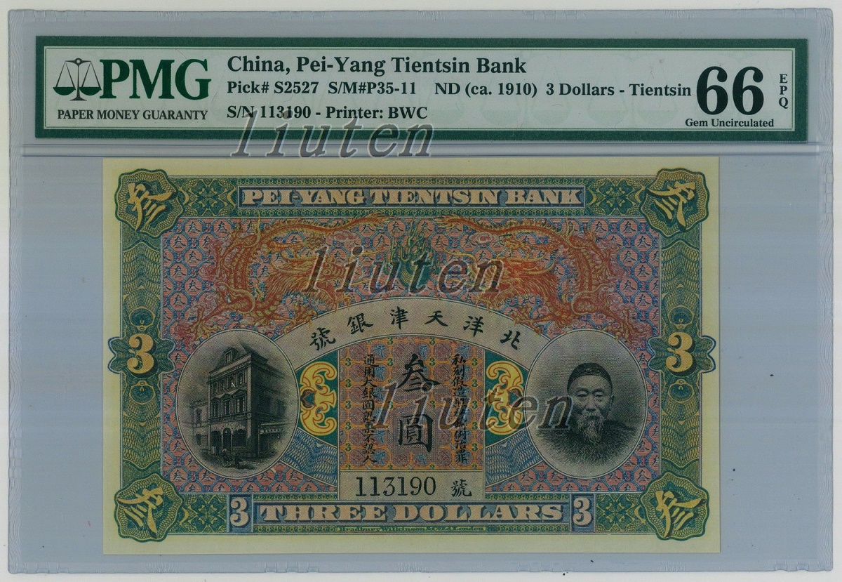宣統元年后,天津銀號所發行的紙幣行名均為北洋天津銀號,由英國Bradbury Wilkinson公司承印,計有壹兩、叁兩、伍兩、拾兩、壹佰兩與壹元、叁元、伍元、拾元、伍拾元、壹佰元等五種銀票及六種銀元票。所有銀票面中間印李鴻章像,下方印風光,銀元票左側為建筑物,右側為李鴻章像,二種票面上均印有雙龍戲珠紋飾,圖案設計高貴美觀,典雅。現存兩種紙幣均已少見,以高值票為最。