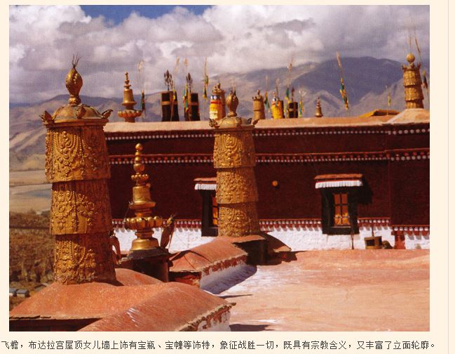 http://www.beita.org/html/cangdixunli/cangdisimiao/budalagong/200903/16-1827.html)里有具體的介紹:“布達拉宮屋頂女兒墻上飾有寶瓶、寶幢等飾特,象征戰(zhàn)勝一切,既具有宗教含義,又豐富了立面輪廓”。稱為“柱子”有所不敬,叫做天線則是無稽之談了。