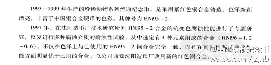 附:《中國印鈔造幣志》關于珍稀動物紀念幣紫銅材料改進記載的截圖: