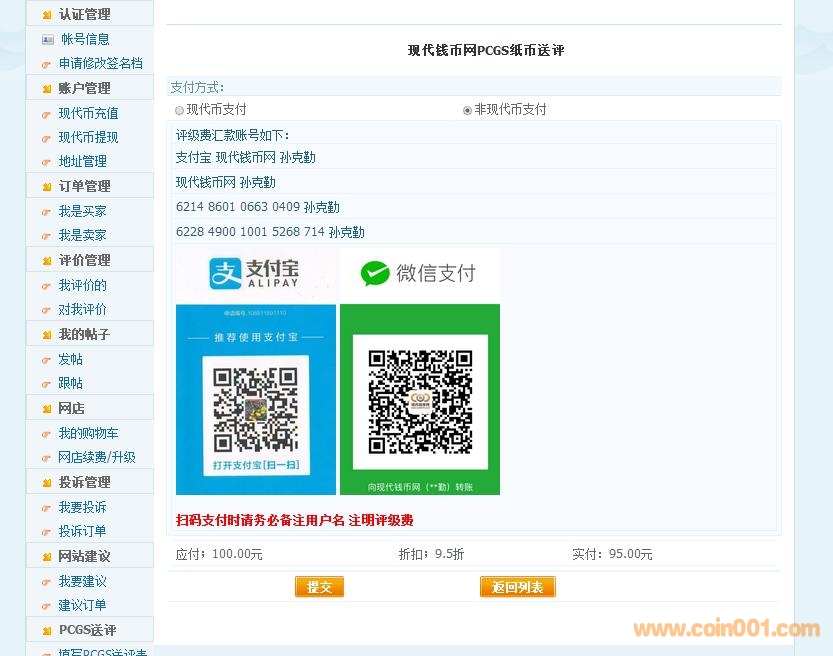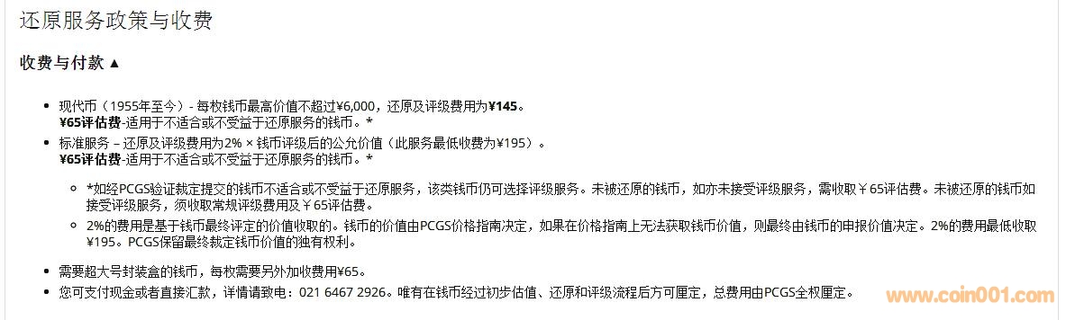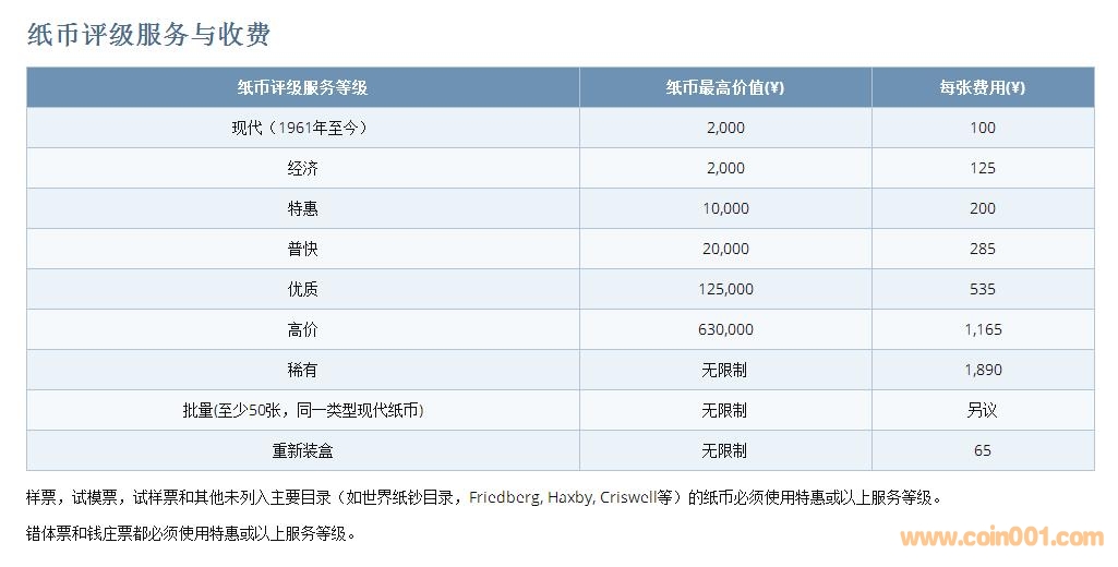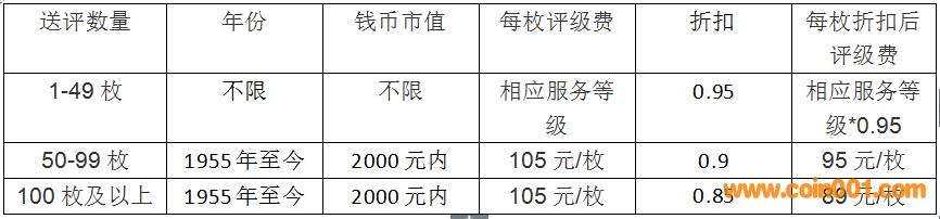 2)紙幣(1961年至今,市值2000元內的紙幣)。批量送評優(yōu)惠:1)一次送評錢幣(紙幣)滿50枚(張),品種不限,即享受評級費9折折扣。2)一次送評錢幣(紙幣)滿100枚(張),品種不限,即享受評級費8.5折折扣。3)贈送透明保護袋及藍色PCGS專用20枚幣盒。(注:折扣不再以贈送現代幣方式返還,而是直接從每枚評級費中折算,只收取折算后的評級費。)現代硬幣送評折扣前后收費標準