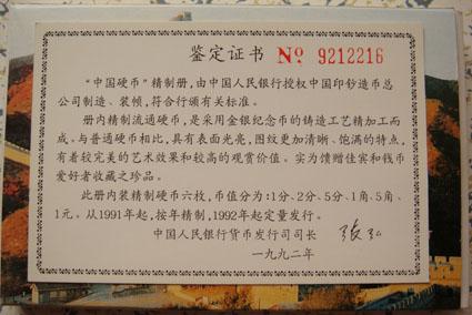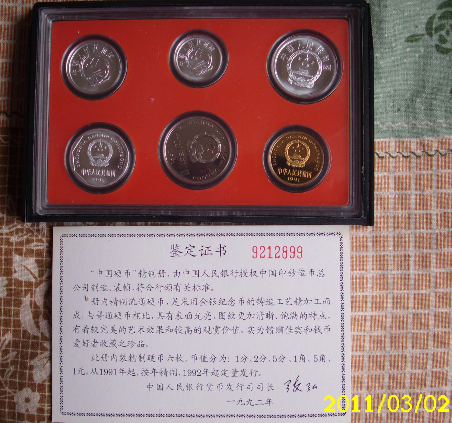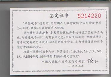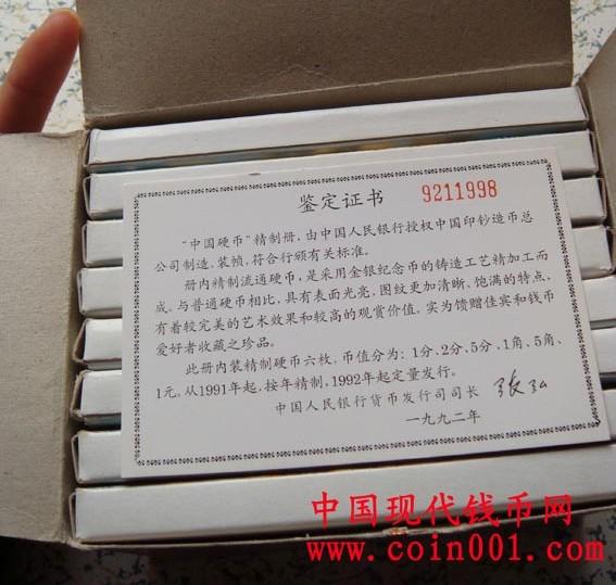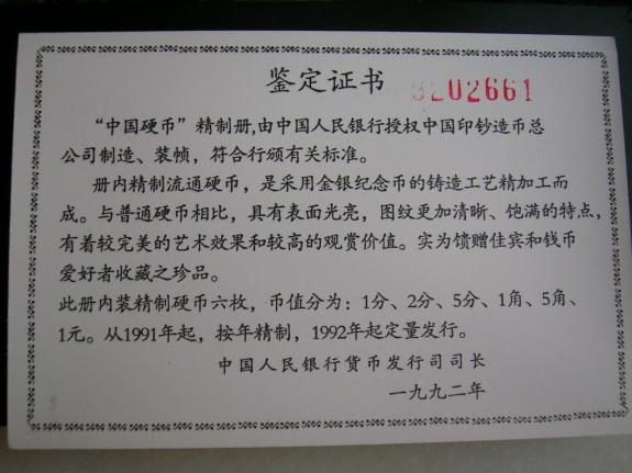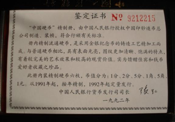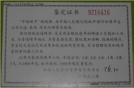 套裝流通硬幣從1979年開始,到1986年是一個時代的特點,就不多說了,從1991年開始又是一個時代的特點.加上了(為了錢幣收藏愛好者的收藏),特別是套裝精制流通硬幣帶有發行量的說明證書.這和紙幣一樣.發行量前面都有一個冠號,1992年到1996年是羅馬數字,1997年到2000年是NO.因為1991年是第一套帶有發行量的精制流通硬幣證書,是1992年發行印制的證書,所以個人認為設計人員就用92代替冠號,這從發行量和原始證書上的數字就可看出.如果是這樣:92前面再加上NO.這是不是畫蛇添足了.所以本人認為帶NO的證書存疑.純屬個人胡思亂想,說錯誤怪.