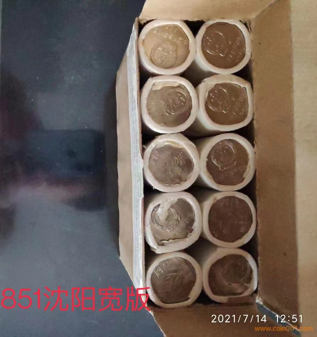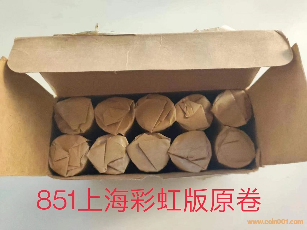 1.油蠟紙人工卷(含彩虹、日出,少磚)出自上海造幣廠,原盒封簽日期基本是85年下半年最后幾個月份,是851最先生產,最先流通,發行數量最少的版本,卷幣采用油蠟紙手工卷包裝,造幣廠采用蠟紙手卷,一般是工藝較好的初打幣,851彩虹版的材質以及工藝與同期生產的新疆紀念幣非常相近(可能采用同一條生產線),有可能851彩虹版幣胚銅鎳合金配比與新疆相同(b25),這樣可以共用相同的卷材條片,新疆的包裝也是油蠟紙手工卷,所以本人猜測851彩虹生產的量應該與新疆紀念幣(450w)相差不遠。 這里我認為只有油蠟紙卷的上海851才能稱為彩虹版,下面介紹的牛皮紙機卷的只能叫做上海普通窄版。