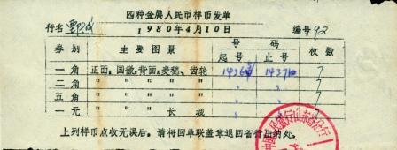 以上的疑問一直到陳志宏發現《四種金屬人民幣樣幣發單》以后才得到圓滿解釋。今年3月8日,一位山東菏澤泉友在網上出售小黑本包裝和證書,共25套證書(含4本空的小黑本,里面的幣已經取走了,一枚幣都沒留下),陳志宏全部買了下來,發現在一個小黑本里面,藏著一張紙,打開一看,是《四種金屬人民幣樣幣發單》(見圖3),發單的時間是1980年4月10日,長城幣發行的時間是4月15日,就是說山東省人行提前5天發放樣幣,發單的下面蓋有“中國人民銀行山東省分行”的騎縫章,下聯已經撕走。從“上列樣幣點收無誤后,請將回單聯蓋章退回省行出納處”得知,此單為上聯,應由接收行鄄城縣留存,下聯撕下蓋章后已經退回了省行出納處。樣幣號碼原來是14364-14370,后涂改為14365-14371,共7套,發往的行名為鄄城,編號為92。我在網上查了一下,山東省共有17個地級市,以及49個市轄區,31個縣級市,60個縣,鄄城縣屬于菏澤市,而菏澤市在山東省地市排名為第17,是最后一個,所以編號為92是完全可以理解的。