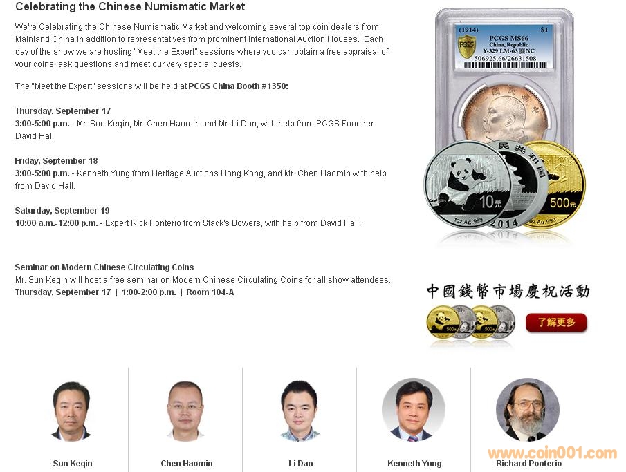 大致安排如下: 展會上每天都會舉辦與專家會面活動,你可以得到一個免費的評估你的硬幣,提問,和我們非常特殊的客人見面的機會。與專家會面活動將在1350#展位: 星期四,九月十七日 下午3:00-5:00專家為孫克勤先生,陳浩敏先生與李丹先生,由PCGS創始人 David Hall 進行協助。 星期五,九月十八日 下午3:00-5:00專家為Heritage拍賣的Kenneth Yung 先生和陳浩敏先生,由 David Hall 進行協助。 星期六,九月十九日 上午10:00 - 12:00 -專家為來自SBP的Richard Ponterio,由 David Hall 進行協助。中國現代流通硬幣講座 孫先生克勤為所有與會者舉辦一場關于中國現代流通硬幣的免費講座。 星期四,九月十七日下午1:00-2:00 104-a室